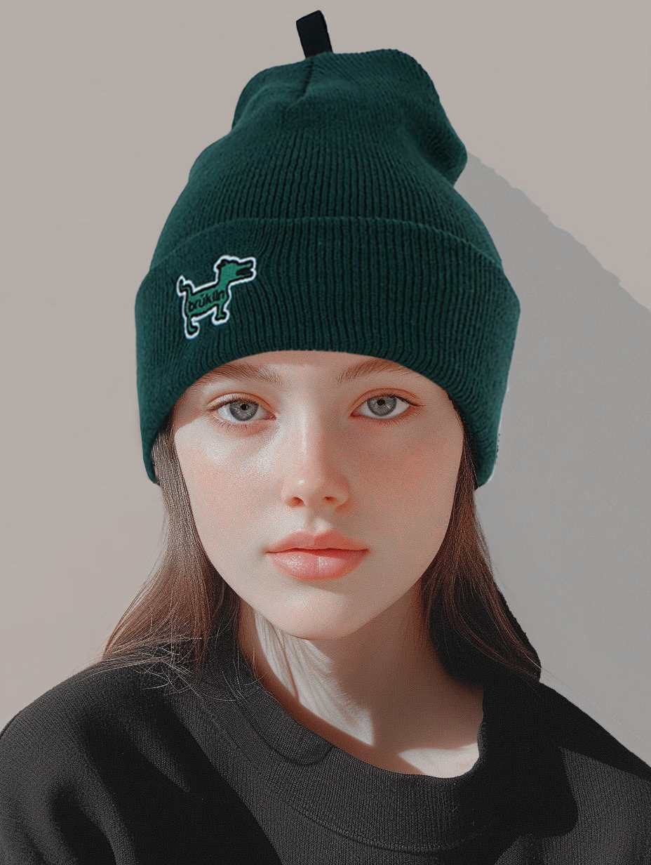 일상 속 포인트 아이템이 되어줄 귀여운 강아지 자수 디테일이 돋보이는 BRUKLIN GREEN DOG BEANIE.